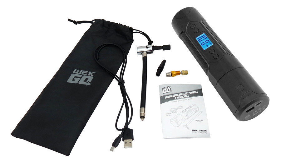 Il compressore aria portatile We’K’Go è in grado di raggiungere la pressione massima di 150 PSI e il peso ridotto di soli 400 grammi lo rendo trasportabile agevolmente.