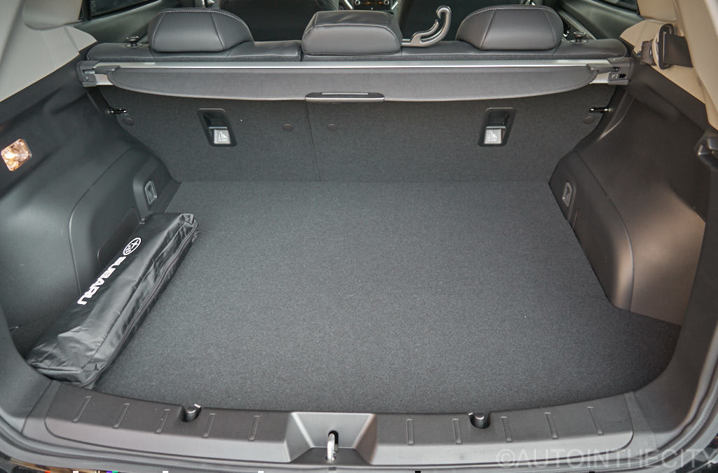 Inoltre, anche le finiture del bagagliaio sono un chiaro indicatore della cura con cui Subaru definisce questo modello. Sotto al piano di carico, una nicchia ha il compito di ospitare il kit destinato agli pneumatici, vista l’impossibilità di ricavare spazio per la ruota di scorta.