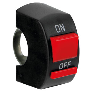 Interruttore universale. 12V - 10A max. Attacco a manubrio. Consente l'accensione e lo spegnimento di faretti o accessori ausiliari anche durante la guida. Universale per la maggior parte delle motociclette con manubrio di diam.22 mm