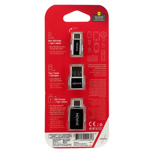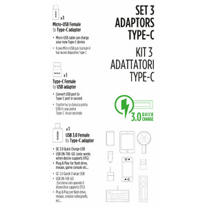 Set 3 adattatori Type-C. 1x micro-USB femmina to Type-C adapter: il cavo Micro-USB può ricaricare il tuo nuovo dispositivo Type-C. 1x Type-C femmina to USB adapter: trasforma la classica porta USB in una porta Type-C in un secondo. 1x USB 3.0 femmina to Type-C adapter: QC 3.0 Quick Charge USB; USB ON-THE-GO (funziona solo quando il dispositivo supporta OTG); Plug & Play per flash drive, mouse, console videogiochi, ecc... Non supporta la trasmissione di segnali video