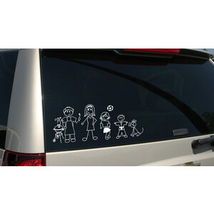Soggetti stampati in bianco su foglio adesivo super trasparente che rappresentano singolarmente ed in modo stilizzato tutti i componenti della famiglia. Family Stickers è la dilagante moda del momento per decorare gli anonimi lunotti delle auto in modo distintivo ed elegante. Creare la propria decorazione è molto semplice: basta scegliere i soggetti che rappresentano il proprio nucleo famigliare ed applicarli sul lunotto posteriore dell'auto