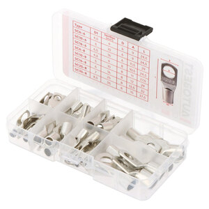 Set di 52 terminali ad anello. Eccellente resistenza alla corrosione e buona conduttività elettrica. Pinza di crimpatura venduta separatamente. Utili per connessioni elettriche sicure e affidabili, in particolare su veicoli, impianti elettrici e applicazioni industriali leggere