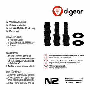Antenna AM/FM in alluminio universale. Fissaggio diretto! Installazione facile fai da te! Alluminio di alta qualità e finitura anodizzata. Ottima ricezione radio. La confezione include: 1 antenna in alluminio, 3 Viti (M6 x M6, M6 x M5, M6 x M4), 2 guarnizioni. La misura é universale e si adatta alla maggior parte dei veicoli (ma solo quelli con una vite esterna per antenna di tipo base). Questa antenna non monta su veicoli del Gruppo FCA (Alfa, Fiat, Jeep...) con base antenna rettangolare, su Opel Crossland, Opel Grandland e Peugeot 2008. Misurare il foro della vite sulla base dell'antenna prima di acquistare il prodotto, un lato del diametro della vite è di 6 mm per l'antenna, l'altro lato è per la base dell'antenna
