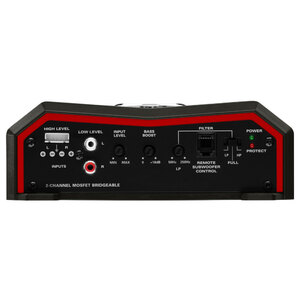 Amplificatore 2 canali. Classe A/B, alimentatore MOSFET. Max power 1600W. RMS power 2x600W 2ohm. RMS power 2x300W 4ohm. RMS power 1x1200W a ponte a 4ohm. Ingressi di livello alto e basso. Crossover passa alto fisso, crossover passa basso variabile, incremento dei bassi variabile. Controllo remoto per subwoofer