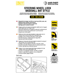 Antifurto blocca volante a forma di mazza da Baseball. 53x5cm. Spessore massimo del volante 3,5cm. Design a forma di mazza da baseball, adatto per la maggior parte delle auto, SUV, furgoni, ecc. Altamente visibile per scoraggiare potenziali malintenzionati. Semplice da bloccare e sbloccare in pochi secondi. Spugna interna per evitare graffi