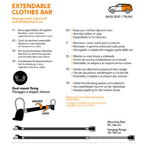 Barra appendiabiti allungabile. Fissaggio a doppio attacco. Mantiene i vostri indumenti organizzati senza stropicciarli in auto. Mantiene i vostri vestiti puliti e ordinati. Realizzato in gomma antiscivolo sulla presa. Allungabile, si adatta alla maggior parte delle auto. Si prega di verificare le misure prima di procedere con l'acquisto. Mounting Size: 95>166cm. Hanging Range: 78>149cm