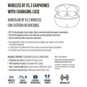 Coppia auricolari wireless Bluetooth BT V5.3 con custodia ricaricabile. Multi funzione. Comandi touch. Tecnologia BT 5.3 per una connessione più stabile, più veloce e con minore consumo energetico. L'unità driver in grafene da 13 mm rende il suono più fluido e profondo