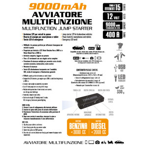 Avviatore 12V per veicoli in panne. Riserva di energia per smartphone e tablet. Torcia LED di emergenza. Fino a 15 avviamenti con una singola carica completa. Per veicoli a benzina fino a 3000cc Per veicoli diesel fino a 2000cc. 9000mAh. Avviatore compatto, leggero ma potente. Protezione di sicurezza multipla per prevenire corto circuiti, corrente eccessiva, sovracarico, sovrascarico. Morsetto di sicurezza. Torcia LED ultraluminosa incorporata con 3 modalità: SOS, strobo di emergenza e illuminzaione generale