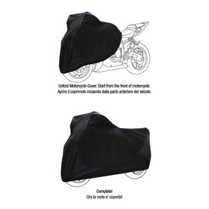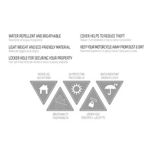 Coprimoto antipolvere. Protezione traspirante per uso da interno. Con foro per lucchetto (lucchetto non incluso). Orlo anteriore e posteriore con elastico. Per uso interno. Traspirabilità. Protezione UV. Idrorepellente. In materiale leggero ed ecologico