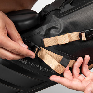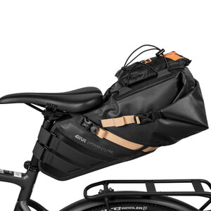 Borsa da sella per bici Gravel e Mountain Bike. Borsa da sottosella impermeabile con capienza variabile da 13>17lt, grazie al sistema di chiusura ROLL-TOP. Ideale per bikepacking e cicloturismo ti permette di portare tutto l'indispensabile per unuscita in bicicletta. Il tessuto in nylon ripstop alta tenacità di cui è composta la rende estremamente resistente e leggera. La presenza di cinghie con regolazione a strap per il fissaggio al tubo della sella e di cinghie regolabili con chiusura a fibbia per il fissaggio sul rail della sella rendono la sua installazione veloce e sicura su ogni tipo di gravel bike. La presenza di applicazioni in TPU con asole per l'installazione di moschettoni e/o luci supplementari e stampe riflettenti completano questo prodotto che non può mancare nel vostro set-up di viaggio. Il sistema integrato Air Valve Technology ne facilita la fase di carico e ottimizza la capienza grazie alla fuoriuscita dell'aria in eccesso