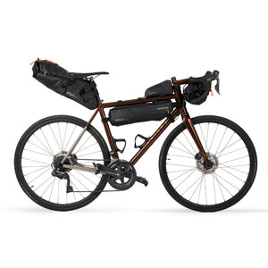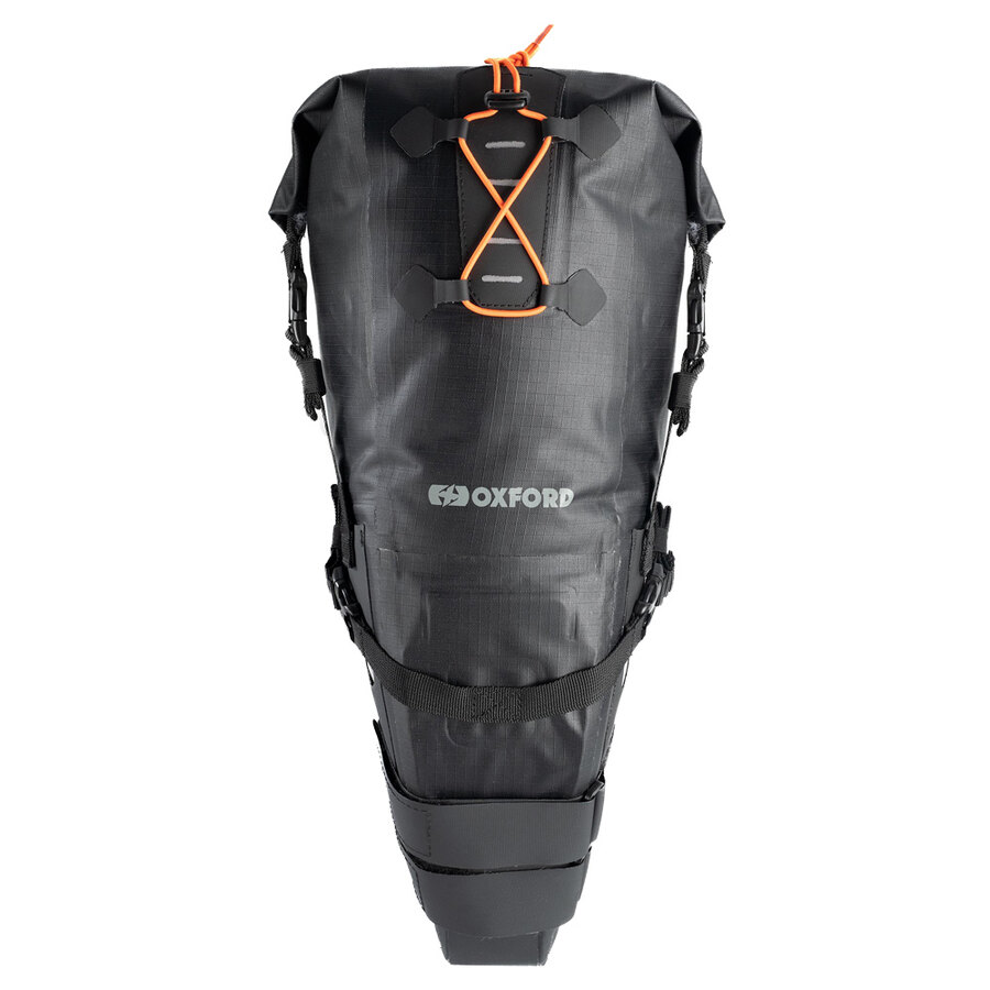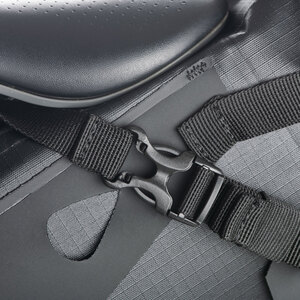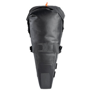 Borsa sottosella. Dotata di una varietà di caratteristiche progettate per affrontare le condizioni meteorologiche e ambientali più difficili durante i lunghi fine settimana o più giorni di guida. Due robuste cinghie a strappo si fissano attorno al reggisella insieme a due clip che si bloccano attorno al binario della sella, riducendo l'oscillazione e mantenendo la stabilità dalla parte posteriore della bici: combinati, i due, aiutano a stare comodo e in controllo quando il terreno diventa accidentato. Materiale TPU 400D Ripstop super leggero. Costruzione saldata. Impermeabile al livello IPX6. Pannelli in Hypalon. Stoccaggio elastico esterno. Capacità 10 litri. Attacco universale per reggisella