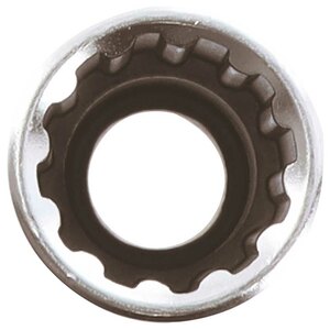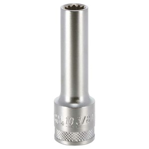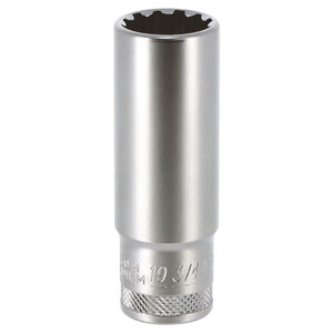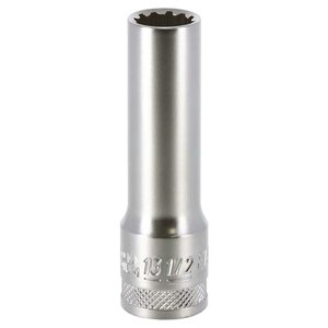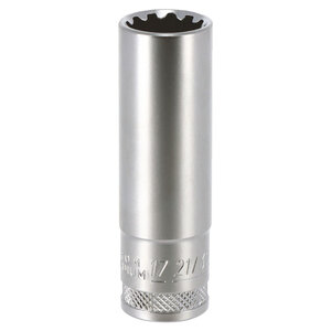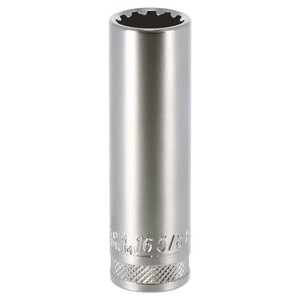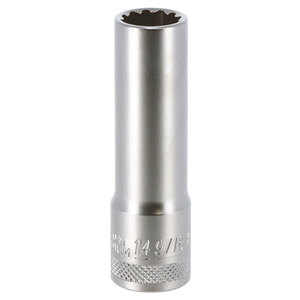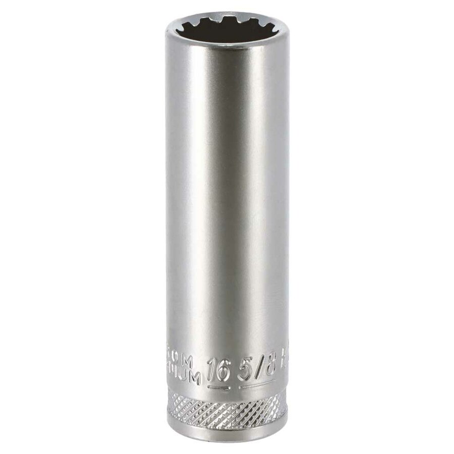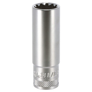 Bussola lunga quadrata in acciaio al cromo vanadio da 1/2". Presenta un nuovo profilo multi-dente, che consente di lavorare su bulloni di diverse dimensioni: 16mm - 5/8" - E20. Lunghezza: 77mm