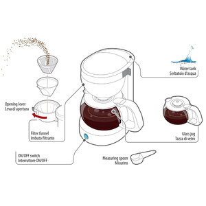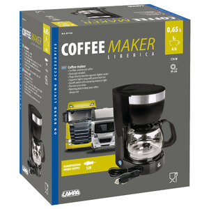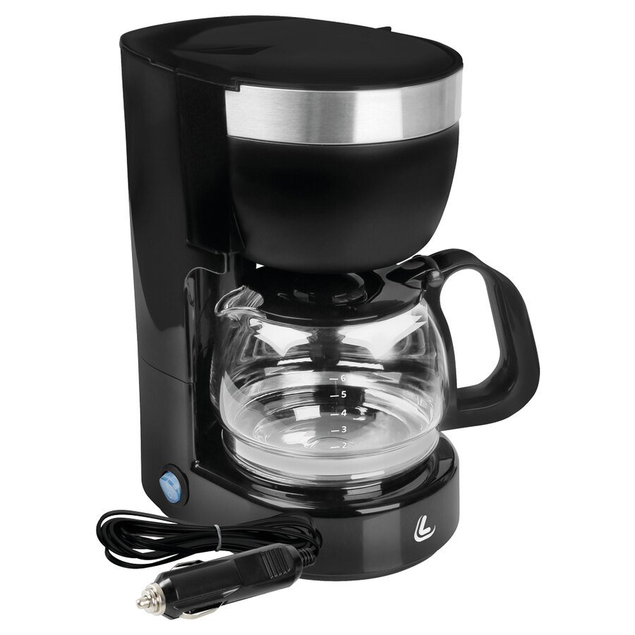 Caffettiera. Per caffè filtrati e solubili. Capacità 0,65 L (4/6 tazze). Completa di contenitore in vetro. Si collega direttamente alla presa accendisigari del veicolo. Spinotto accendisigari con fusibile di protezione. Cavo alimentazione da 95cm. Interruttore on/off con spia luminosa di funzionamento. Protezione termica. Piastra riscaldante per mantenere il caffè sempre caldo dopo la preparazione