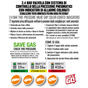 Valvola con sistema di controllo della pressione pneumatici con indicatori di allarme colorati. Universale per auto e moto cui sono consigliati 2.4 bar. Segnalazione visiva immediata per una guida più sicura: le segnalazioni visive colorate avvisano quando la pressione dei pneumatici è bassa per una maggiore sicurezza e durata dei pneumatici. Migliora la tenuta su strada e riduce la frenata. Riduce l'usura e la deformazione dei pneumatici. Aumenta l'efficienza del carburante. Economico: non è richiesta nessuna batteria