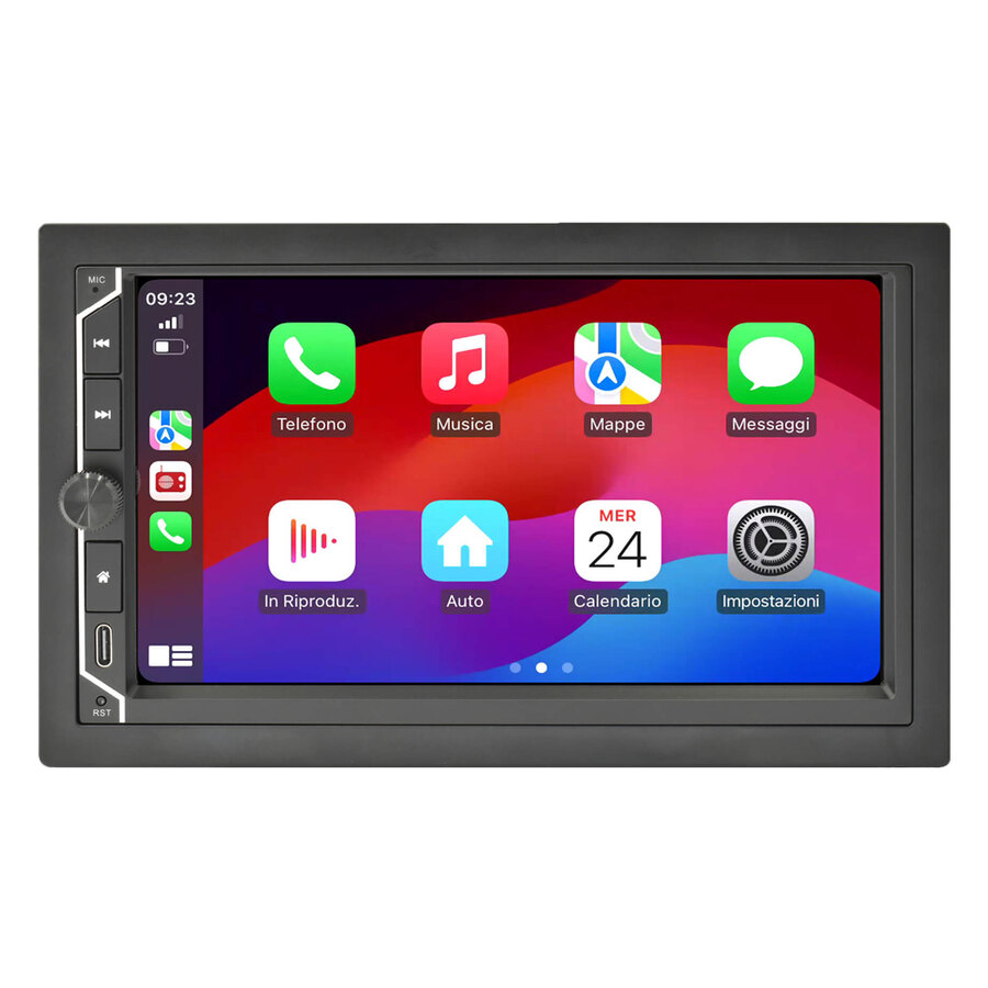 Sistema multimediale Android con Apple CarPlay ed Android Auto wireless. Monitor TFT/LCD 6.75" touch screen capacitivo. Risoluzione 1024x600 pixel. Avvio ultraveloce. Sistema operativo ANDROID 12. Memoria ROM 32Gb. RAM 4Gb. Apple CarPlay e Android Auto wireless con ZLink5. Sintonizzatore Radio FM/AM/RDS/EON PLL. Ricevitore Dab+ USB. Memorizzazione ultima posizione. 1 porta USB Type A posteriore per ricevitore DAB+ o libera installazione multimediale max 128 Gb. 1 porta USB Type C frontale (max 128Gb). 1 adattatore USB Type C a Type A. 1 ingresso A/V posteriore. File audio supportati: MP3, AAC, WAV, FLAC, APE. File video supportati: MPEG, AVI, RM, FLV, ASF/WMV, MP4, MKV, OGM, TS. Bluetooth V5: Vivavoce con microfono esterno e A2DP. Accesso ad internet anche tramite connessione Bluetooth (tethering). Antenna GPS. Navigazione ON-LINE (tramite Google Maps o AppleCarPlay o AndroidAuto). 1 Ingresso Retrocamera (non inclusa). Uscita subwoofer e pre-out 4x45W power. Equalizzatore a 16 bande