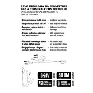 Cavo prolunga da connettore Sae a terminale con occhiello. Ottima protezione dei fusibili interni. Design robusto per veicoli a 6V-24V. Connessione rapida per batteria e caricabatteria. Di ampia applicazione, adatto per auto, moto, scooter, ecc Design perfetto per collegare e scollegare la batteria senza sforzo