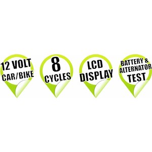 Caricabatteria & Tester. Caricabatteria con microprocessore, sensore automatico della temperatura incorporato e funzione di tester di batteria e alternatore. Ideale per la manutenzione di batterie installate sia su motocicli, sia su automobili con batterie fino a 150 Ah. 3 programmi: CAR per batterie auto, BIKE per batterie moto, Start&Stop per batterie AGM/EFB. Display LCD con voltmetro digitale. Funzione tester batteria: esegue il test guidato della batteria (stato di carica e spunto) e del sistema di carica (alternatore/regolatore). Algoritmo di carica a 8 cicli: recupera (da 1,25V), carica, desolfata, analizza, mantiene ed equalizza. Tipi di batterie: tradizionali, gel, MF, AGM, EFB, VRLA, Ca/Ca. Sensore di temperatura incorporato. Protezioni: inversione di polarità, corto circuito, sovraccarica, surriscaldamento. Non fa scintille. Tensione Ingresso: 220÷240Vac,50-60Hz..Tensione Carica: 13.8V/14.4V-nom.12V. Corrente Carica: 1A max (Bike)/3.5A max (Car/Start&Stop). Garanzia 5 anni