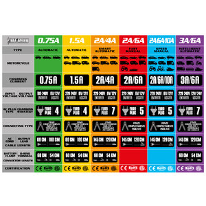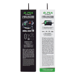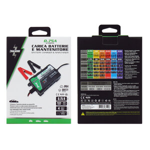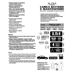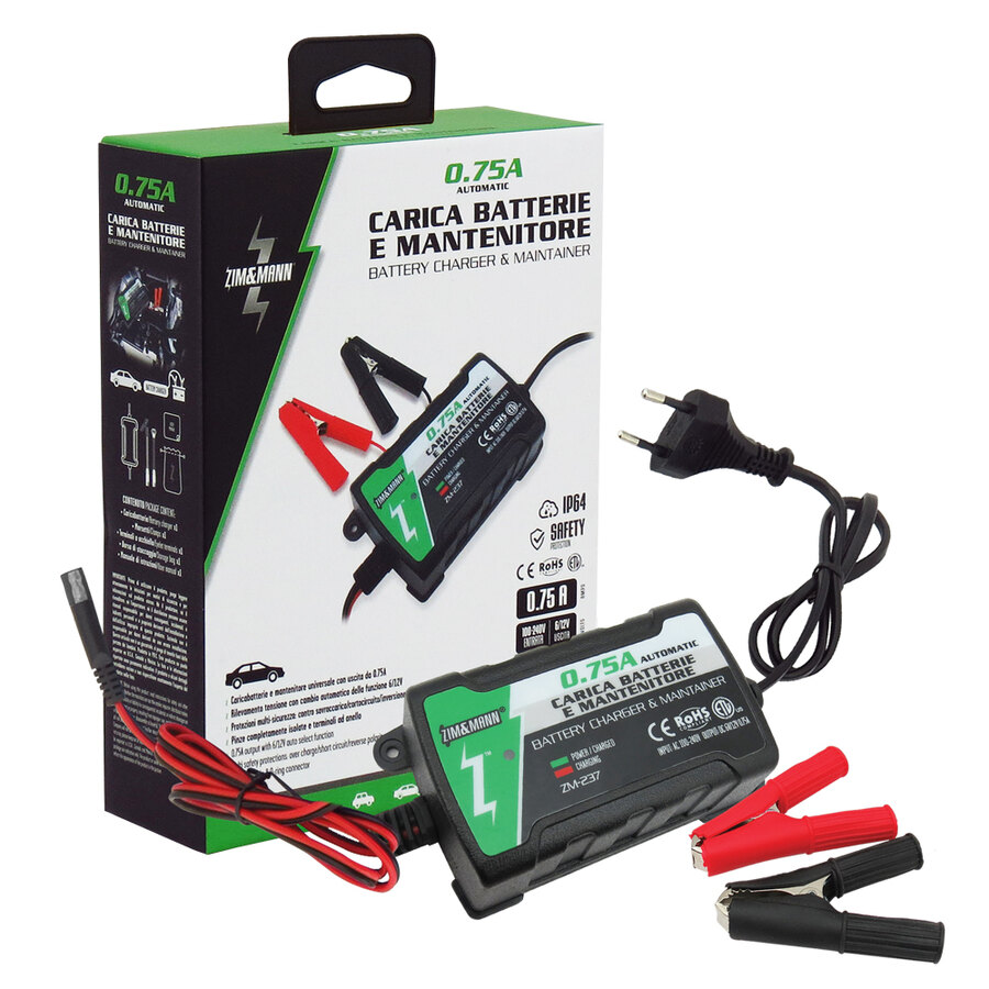 Carica batterie e mantenitore impermeabile automatico Standard. 4 fasi di carica: diagnostica, carica soft, carica graduale, mantenimento/controllo. Uscita da 0.75A per caricabatterie e mantenitore. Rilevamento automatico della tensione 6/12V. Protezione contro il sovraccarico, cortocircuito e inversione di polarità. Morsetti batteria con manici isolati con terminali ad anello. Carica batterie programmabile e innovativo con rilevamento automatico della tensione. Ideale per moto/auto/barche/macchinari agricoli ecc.. Universale adatto a tutte le batterie Piombo-Acido comprese le batterie WET, MF, FA, AGM e GEL. Rilevamento batterie guaste e ripristino. Progettato per collegamenti veloci e facili su applicazioni varie