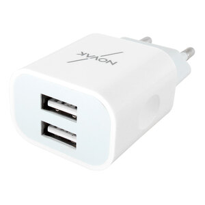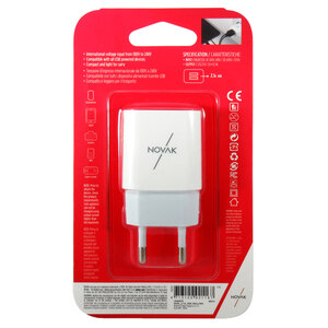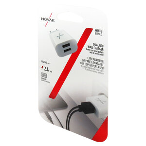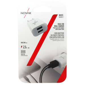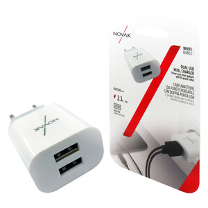Caricabatterie da parete portatile con doppia porta USB. Ideale per ricaricare tramite la presa a muro. Input: 100/240V / 50-60Hz / 0.15A. Output: 5V-2.1A. Compatibile con tutti i dispositivi alimentati tramite USB. Compatto e leggero