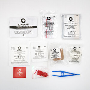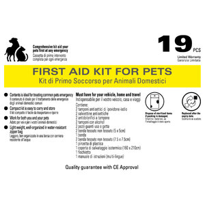 Kit di Primo Soccorso per Animali Domestici. Il contenuto è ideale per il trattamento delle emergenze degli animali domestici comuni. Il kit compatto è facile da trasportare e riporre. Adato per voi e per i vostri animali domestici. Leggero, ben organizzato in una borsa con cerniera resistente all'acqua. Indispensabile per il vostro veicolo, casa e viaggi. Contiene 19pz: 2 tamponi antisettici di ipovidone-iodio, 2 salviettine antisettiche, 2 antidolorifici a tampone, 2 tamponi con alcohol, 2 pezzi guanti usa e getta, 2 benda tessuto non tessuto (5 x 5cm), 1 benda, 2 benda tessuto non tessuto (7.5 x 7.5cm), 1 pinzetta di plastica, 1 coperta di salvataggio isotermica (160 x 210cm), 1 fischietto, 1 manuale di istruzioni (multi-lingue)