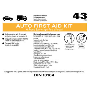 Kit pronto soccorso per auto e furgoni. Cassetta di primo intervento completa per ogni emergenza composta da 43 pezzi. Offre un'assistenza globale per far fronte a qualsiasi tipo di emergenza durante i vostri viaggi o nella quotidianità. Certificazione di qualità con omologazione CE. Conforme alle norme europee DIN 13164. Contiene: 1 cerotto in rotolo 5m x 2,5cm, 14 cerotti (misure miste), 2 tampobende sterili 8x10cm, 1 tampobenda sterile 10x12cm, 1 tampobenda sterile 6x8cm, 1 coperta di soccorso isotermica 160x210cm, 1 paio di forbici, 4 guanti usa e getta, 1 benda per ustioni 40x60cm, 1 benda per ustioni 60x80cm, 2 salviette detergenti, 5 bende elastiche (misure miste), 6 garze sterili 10x10cm, 2 bende triangolari 136x96x96cm, 1 manuale di istruzioni(multi-lingue)