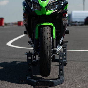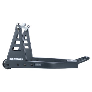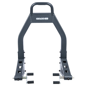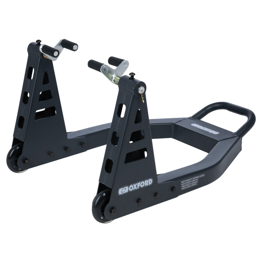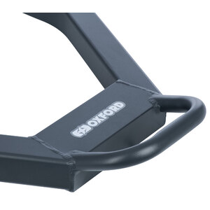 Cavalletto alzamoto anteriore da forcella: scientificamente progettato per ridurre al minimo lo sforzo richiesto per alzare la moto. Alluminio di grado aerospaziale 6063-T5. Tubo quadrato per impedire la rotazione. Impugnatura angolata per una maggiore leva e un sollevamento controllato. Base sovradimensionata per una maggiore stabilità. Carico massimo: 300kg. Peso del supporto: 4kg. Altezza di sollevamento: 300mm (centro del perno)