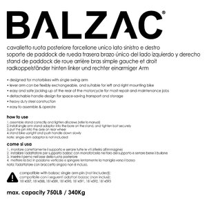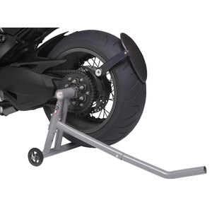 Cavalletto ruota posteriore forcellone unico lato sinistro e destro. Progettato per moto con forcellone singolo. Il braccio sollevatore può essere intercambiabile in modo flessibile ed è adatto per il montaggio sia a sinistra che a destra della moto. Sollevamento semplice e sicuro della parte posteriore della moto, ideale per la maggior parte dei lavori di riparazione e manutenzione. Maniglia rimovibile per facilitare il trasporto ed agevolare il rimessaggio salvaspazio. Struttura in acciaio resistente. Facile da montare e da utilizzare. I perni specifici moto per moto vanno acquistati separatamente (non inclusi in confezione), vedi nostri codici: 1814587, 1814588, 1814589, 1814590, 1814591, 1814592, 1814593
