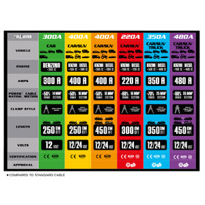 Cavi batteria per auto. Cavo con sezione esterna di 14mmq con pinze speciali con manici isolati antiscossa. Portata d'avviamento superiore a 300A. 50% in più di conduttività rispetto ad un cavo tradizionale. Realizzati in rame resistente riverstito con alluminio di qualità. Nessun groviglio di cavi grazie al cablaggio semi-unito facile da arrotolare. Progettati per auto benzina fino a 2000cc. 12V. Cavo 250cm