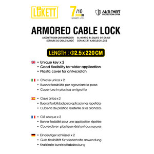 Lucchetto con cavo corazzato. Buona flessibilità per semplificare l'applicazione. Copertura in plastica antigraffio. Chiave unica x2. Diam.: 2,5x220cm