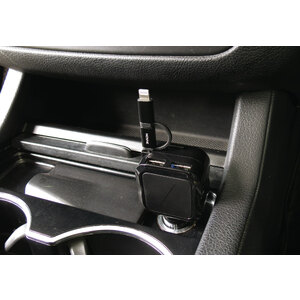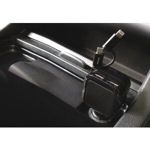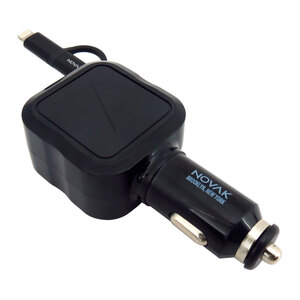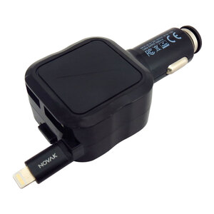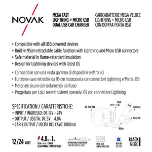 Caricabatterie mega veloce. Connettori Lightning + micro USB. Con doppia porta USB. USB 4,8A + Lightning 1A. Cavo avvolgibile 95cm. Blue LED. Compatibile con una vasta gamma di dispositivi elettrici. Progettato per i più recenti sistemi operativi OS con connetore Lightning. Input: DC 12V-24V. Output: DC 5V-4,8A. Cable Output: 1000mA