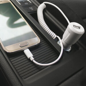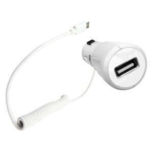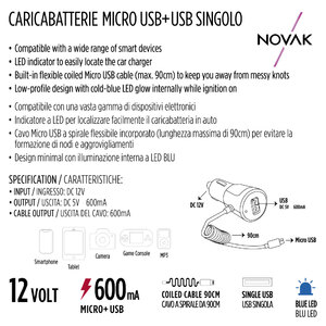 Caricabatterie Micro USB + USB singolo. Compatibile con una vasta gamma di dispositivi elettronici. Indicatore LED per localizzare facilmente il caricabatterie in auto. Cavo lMicro USB a spirale flessibile incorporato (lunghezza massima 90cm) per evitare la formazione di nodi e di aggrovigliamenti. Design minimal con illuminazione interna a LED Blue. Input: DC 12V Output DC 5V-600mA