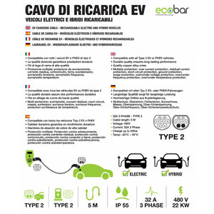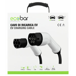 Cavo di ricarica EV: veicoli elettrici e ibridi ricaricabili. Compatibile con tutti i veicoli EV o PHEV di tipo 2. Fili in lega di rame di alta qualità. Protezione multipla, protezione da: sovracorrente, corrente residua, cortocircuito, terra, sovratensioni, sovra/sotto tensione, sovra/sotto frequenza, sovra/sotto temperatura. Corrente: 32A 3 Fasi. Potenza di Uscita: 22kW. Tensione nominale: 480V AC. Temperatura di funzionamento: - 30° - + 50°. Protezione di ingresso: IP55. Spina di alimentazione: Spina Femmina di Tipo 2 & Spina Maschio di Tipo 2. Lunghezza cavo 5m