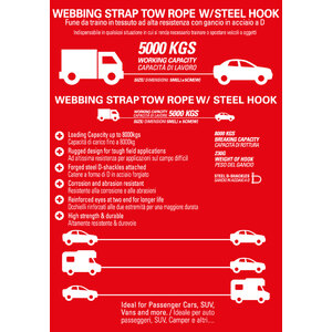 Fune da traino in tessuto ad alta resistenza con gancio in acciaio a D. Capacità di lavoro 5000 kg. Capacità di carico fino a 8000 kg. Ad altissima resistenza per applicazioni sul campo difficili. Catene a forma di D in acciaio forgiato. Resistente alla corrosione e alle abrasioni. Occhielli rinforzati alle due estremità per una maggiore durata. Altamente resistente e durevole. Peso di Hook: 230g