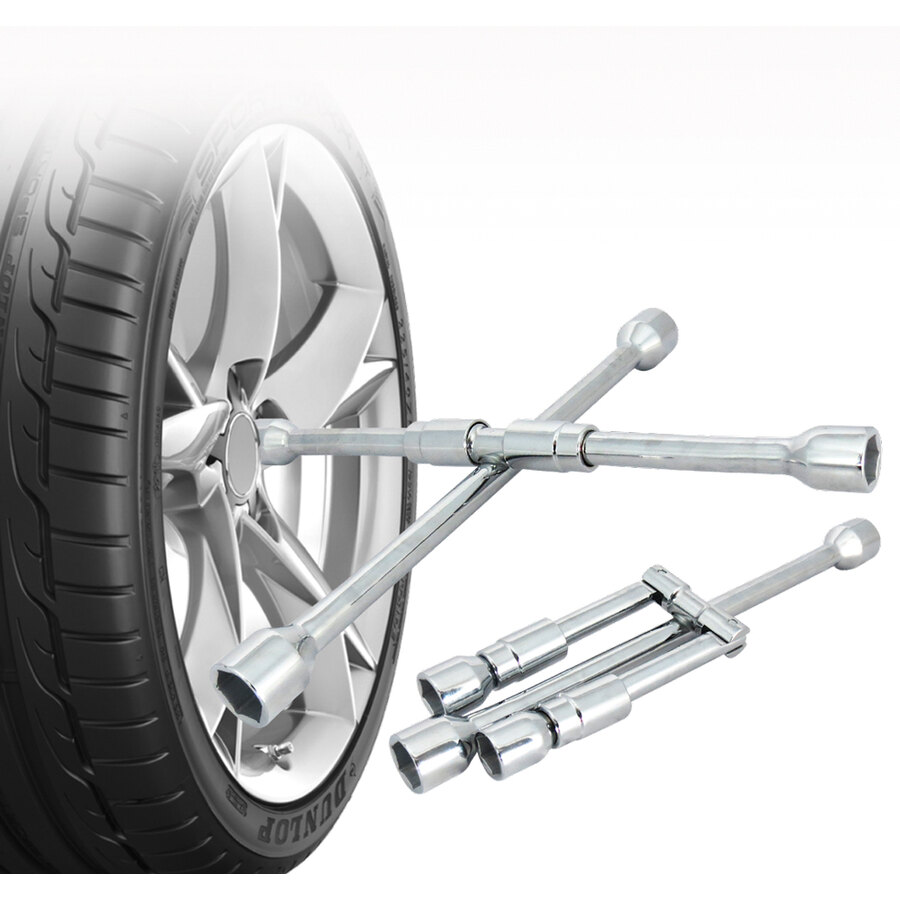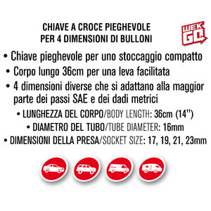 Chiave a croce pieghevole. Per 4 dimensioni diverse di bulloni (17-19-21-23mm) che si adattano alla maggior parte dei passi SAE e dei dadi metrici. parte centrale robusta. Corpo lungo per una leva facilitata