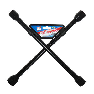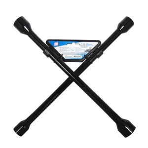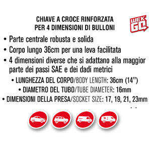 Chiave a croce rinforzata. Per 4 dimensioni diverse di bulloni (17-19-21-23mm) che si adattano alla maggior parte dei passi SAE e dei dadi metrici. parte centrale robusta. Corpo lungo per una leva facilitata
