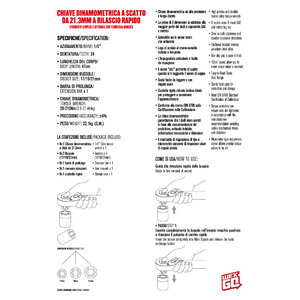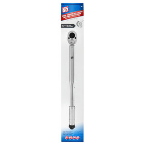 Chiave dinamometrica a scatto da 21,3mm a rilascio rapido. Azionamento 1/2". Dentatura: 24 Lunghezza 47cm Bussole incluse: 17/19/21mm Con prolunga. Precisione: +/-4% Torque wrench: 28-210Nm
