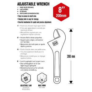 Chiave inglese regolabile. Il foro per appendere è comodo per riporre gli attrezzi. Meccanismo zigrinato per una regolazione rapida e precisa. Ganascia regolabile. Apertura max 24mm. 8" - 200mm
