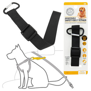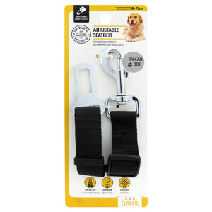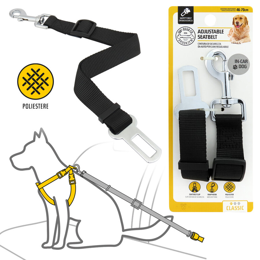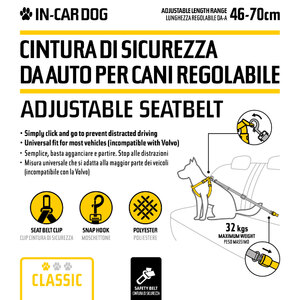Cintura di sicurezza per auto per cani regolabile. Lunghezza regolabile da 46 a 70cm. Peso massimo 32kg. Semplice da utilizzare: basta agganciare e partire. Misura universale che si adatta alla maggior parte dei veicoli (incompatibile con la Volvo). In poliestere