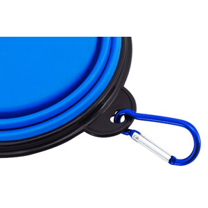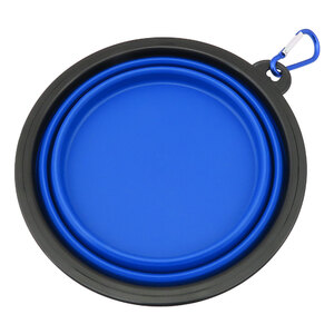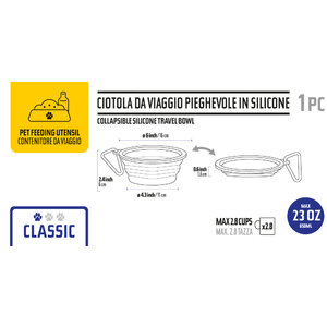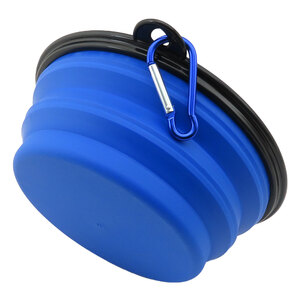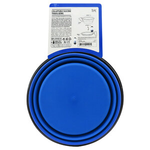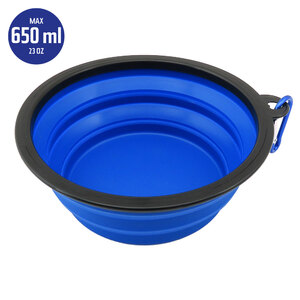 Ciotola da viaggio pieghevole, in silicone. Capacità 650ml. Dimensioni chiusa: h1,6cm x diametro16cm. Dimensioni aperta: diam. inferiore 11cm, diametro superiore 16cm x h6cm