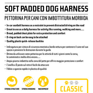 Pettorina per cani con imbottitura morbida. Mantiene il vostro cane sicuro durante il viaggio. Imbragatura per cintura di sicurezza. Ottimo da utilizzare come pettorina per le attività di tutti i giorni come la corsa, le camminate e molto altro ancora... Ampia piastra imbottita nella zona del petto per offrire maggior protezione e comfort. Fibbie a sgancio rapido in plastica di qualità