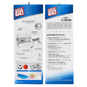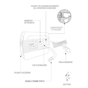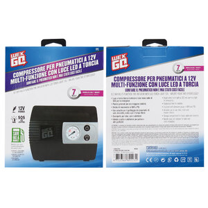 Compressore per pneumatici a 12V multi-funzione con luce led a torcia. Gonfiare il pneumatico non è mai mai stato così facile. Gonfia in soli 7 minuti (riferito a pneumatici standard 195/65R15). Benefici per una corretta pressione dei pneumatici: minor consumo di carburante, minor usura dei pneumatici, maggior sicurezza. Luce a torcia bianca luminosa e luce rossa calda di SOS per le emergenze. Piedini gommati per una maggiore stabilità. Dotato di manometro in BAR e PSi. Uso versatile per il gonfiaggio dei pneumatici di auto, biciclette, moto e per il tempo libero. Scomparto per tubi, cavi e adattatori. Valvola a spillo e adattatore per palloni e altri gonfiabili. Pressione massima: 8.2BAR/120PSi. Alimentazione: presa accendisigari a DC12V. Corrente massima: 10A. Lunghezza del cavo: 300 +/- 10cm. Lunghezza del tubo: 55+/-5cm. Luce: nr.7 luci LED