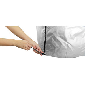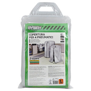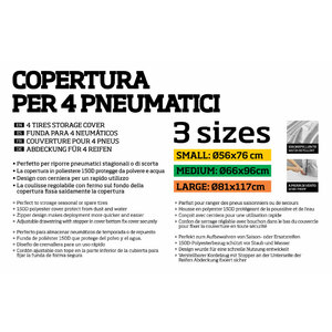 Copertura per 4 pneumatici. Perfetto per riporre pneumatici stagionali o di scorta. La copertura in poliestere 150D protegge da polvere e acqua. Design con cerniera per un rapido utilizzo. La coulisse regolabile con fermo sul fondo della copertura fissa saldamente i pneumatici. Per scegliere la misura corretta va misurato il diametro e la larghezza della ruota da un bordo esterno all'altro