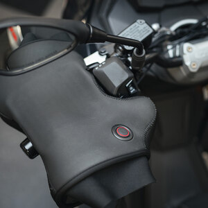 Moffole da moto riscaldate in neoprene, progettate per garantire protezione dagli agenti atmosferici e comfort termico grazie a un elemento riscaldante integrato con regolazione su 3 livelli. Protezione completa contro gli agenti atmosferici grazie a materiali impermeabili e cuciture termosaldate. Polsino elastico regolabile con parapioggia integrato. Fodera superiore in pile sintetico per isolamento termico. Dettagli riflettenti per visibilità aumentata in condizioni di scarsa illuminazione. Compatibili con manubri fino a 22mm di diametro. Elemento riscaldante integrato con connettore impermeabile. Regolazione del calore su 3 livelli: rosso (100%), verde (75%), blu (50%). Alimentazione 12V DC tramite cavi ad anello. Consumo massimo: 16W a 12V (100% di potenza). Protezione tramite fusibile in linea da 3A per garantire la sicurezza