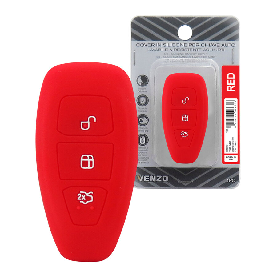 Cover in silicone per chiave auto. Realizzata in materiale morbido al tatto, inodore, di lunga durata e con design antiscivolo. Protegge le chiavi dallo sporco e dai graffi. Facile da installare in pochi secondi. Calzano perfettamente senza compromettere le funzionalità dei tasti. Lavabile e resistente agli urti. Compatibile con Ford modello: Fiesta ST 2015, Focus ST 2015, C-Max e Mondeo 2013