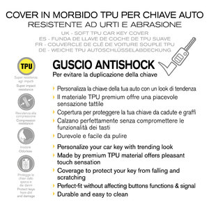 Cover per chiave auto in morbido TPU. Resistente ad urti e abrasione. Inodore. Resistenza alla compressione. Protegge le chiavi dallo sporco e dai danni. Personalizza la chiave della tua auto con un look di tendenza. Il materiale TPU Premium offre piacevole sensazione tattile. Calza perfettamente senza compromettere le funzionalità dei tasti