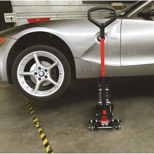 Cric idraulico professionale da 3 tonnellate, profilo ribassato. Questo cric compatto a doppia pompa da 3000 kg è ideale per un uso intensivo. La sua altezza ridotta consente il sollevamento di veicoli sportivi molto bassi. La maniglia è protetta per evitare il contatto con la carrozzeria. Include quattro ruote silenziose in poliuretano, un pedale di avvicinamento e un cuscinetto protettivo in gomma. Impugnatura ergonomica. Doppia pompa. Ruote posteriori girevoli a 360°. Altezza di sollevamento: 360 - 505mm. Dimensioni cric: 75x36x129cm (con maniglia). Peso: 35,5kg. Standards CE