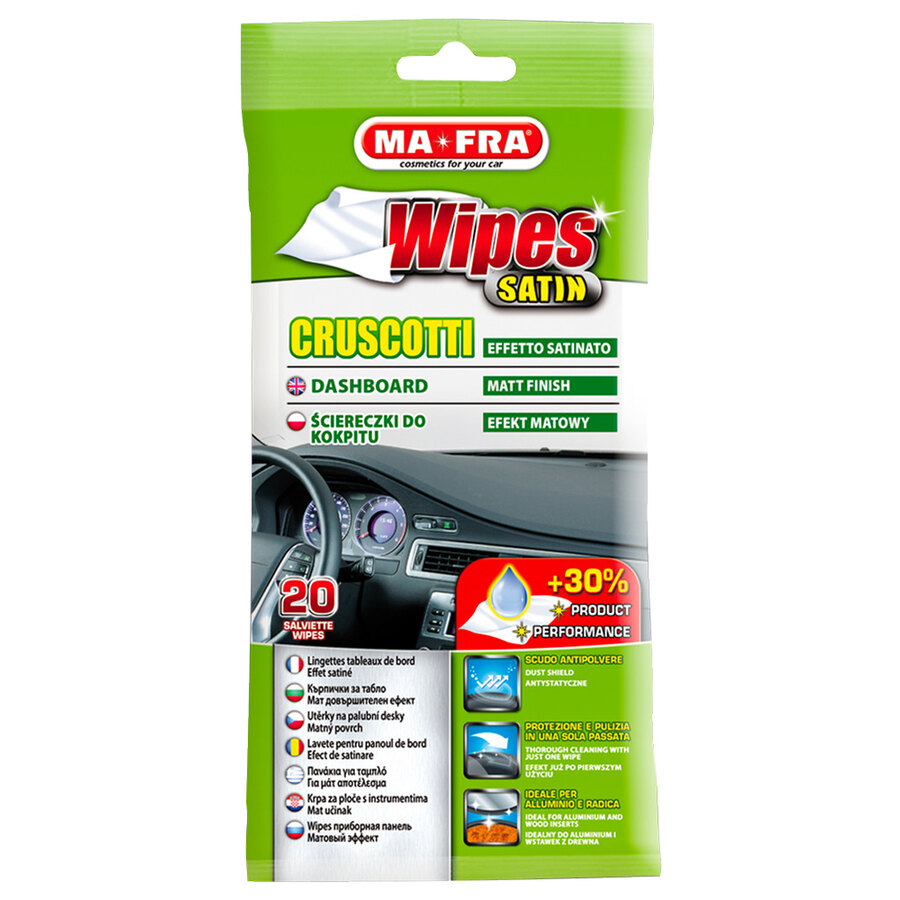 Salviette monouso per cruscotti satinati. Dona al cruscotto il colore satinato originale. Crea una barriera protettiva antipolvere. Non unge. Sono panni con struttura a nido d'ape, tessuto in microfibra porosa, adatti per ravvivare, pulire e proteggere anche cruscotti in alluminio e radica. La struttura a nido d'ape dei panni facilita la rimozione dello sporco e della polvere, rilasciando nell?abitacolo un gradevole profumo e freschezza di pulito