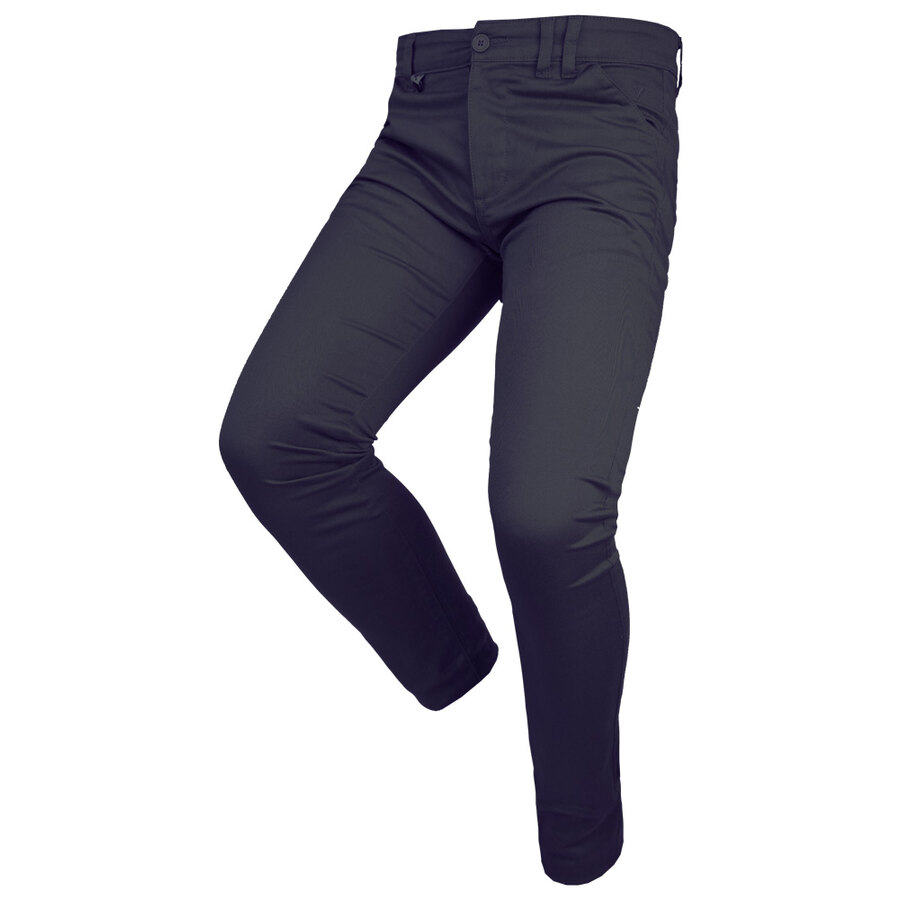 Pantalone realizzato in tessuto di cotone resistente all'abrasione. Slim-Fit. Tecnologia Core Yarn. Un unico strato di tessuto, senza fodera. Include cinque tasche esterne. Chiusura con zip YKK®. Tasche interne per protezioni fianchi e ginocchia (regolabili a due altezze). Protezioni anca in schiuma. Protezioni ginocchio rimovibili certificate "Flexishock" EN1621-1:2012 CE Livello 2. Prodotto omologato per moto CE EN17092-3:2020 Livello AA