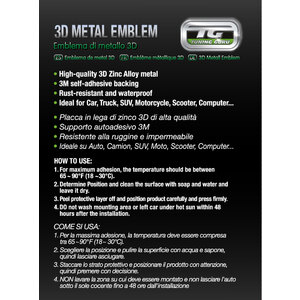 Placca in lega di zinco 3D di alta qualità. Supporto autoadesivo 3M. Resistente alla ruggine e impermeabile. Ideale su Auto, Camion, SUV, Moto, Scooter, Computer..