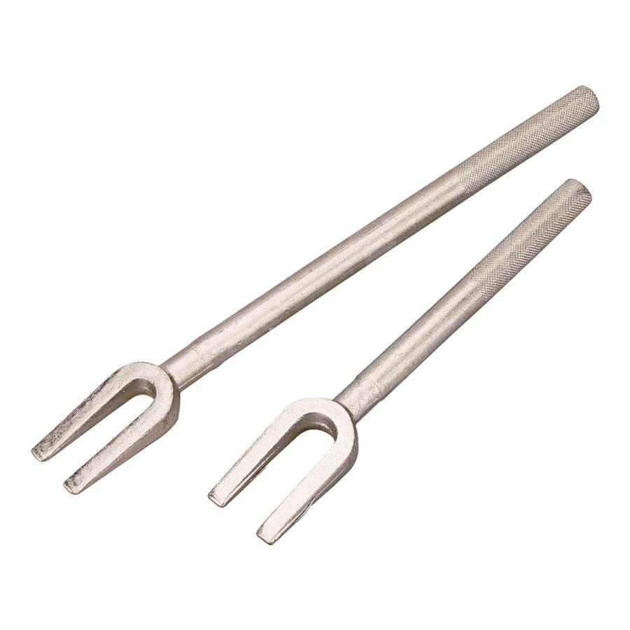 Kit 2 estrattori giunto sferico. Permettono la rimozione dei perni dei giunti sferici al perno dello sterzo o ai terminali di accoppiamento delle sospensioni. Lunghezza 400mm per larghezza artiglio interno: 21mm. Lunghezza 300mm per larghezza artiglio interno: 26mm